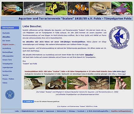 Gleich vier Jubiläen feiert der Aquarien- und Terrarienverein "Scalare" 1925/55 e.V. Fulda in 2025. Der in 1925 gegründete Verein wird 100 Jahre alt. Den Tümpelgarten gibt es seit 60 Jahren am Standort Maberzeller Straße in Fulda. Im Jahr 2000 ging die Aquarien- und Terrarienausstellung im Rudi-Schmitz-Haus nach 3 Jahren Bauzeit in Betrieb. Die Webseite des Vereins startete ebenfalls in 2000 und wird diese Jahr am 3. Oktober 25 Jahre alt. Für das Jubiläumsjahr sind einige Veranstaltungen und Vorträge geplant, über die wir Sie an dieser Stelle und in der Rubrik „Termine“ informieren. Diese Seite wird regelmäßig aktualisiert und um weitere Termine ergänzt. Zu unserer Festveranstaltung im August erscheint eine Festschrift über den Verein mit interessanten Artikeln, die bei Interesse zum Selbstkostenpreis erworben werden kann. Wir würden uns freuen, wenn wir Sie in unserem Jubiläumsjahr regelmäßige im Tümpelgarten in Fulda begrüßen dürfen.