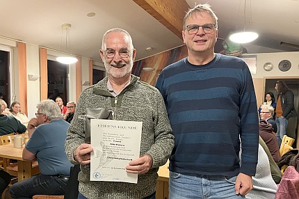 Schriftführer Sven Haustein hob in seiner Laudatio die Verdienste des langjährigen Vereinsmitglieds hervor. Seit genau 45 Jahren ist Aldo Pollera im Verein aktiv und gehörte viele Jahre dem Vorstand an. „Aldo ist ein talentierter Handwerker und begnadeter Kunsthandwerker“, betonte Haustein in seinen Ausführungen. Auf dem Spielplatz im Tümpelgarten steht beispielsweise ein Krokodil, dass Aldo Pollera aus einem Baumstamm gefertigt hat. Aber auch als Aquarianer hat sich der aus Italien stammende Aldo Pollera verdient gemacht. In der alten Ausstellung in der Georg-Rösch-Hütte pflegte er u.a. Piranhas. Viele Jahre genossen die „Scalare“ kühle Abende vor dem Kamin auf der Terrasse, den Aldo gebaut hatte.