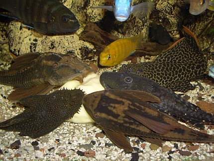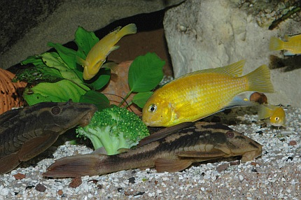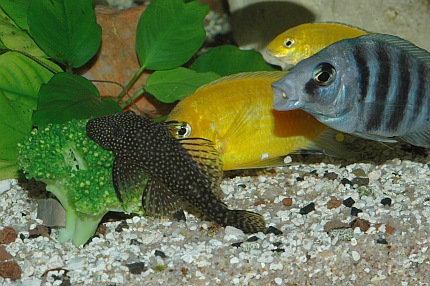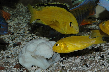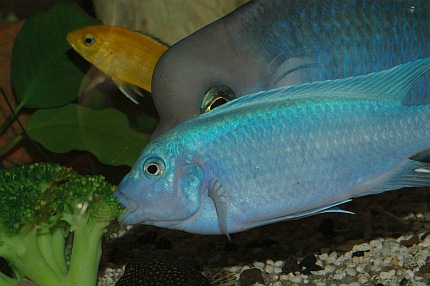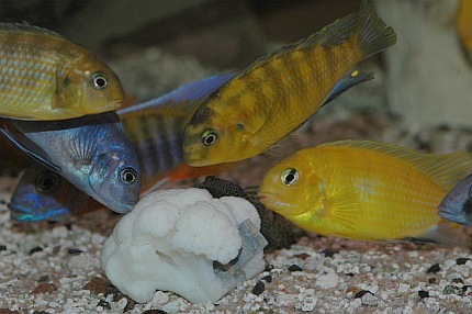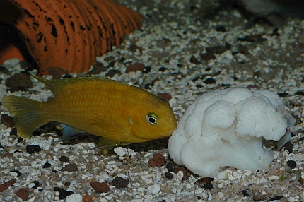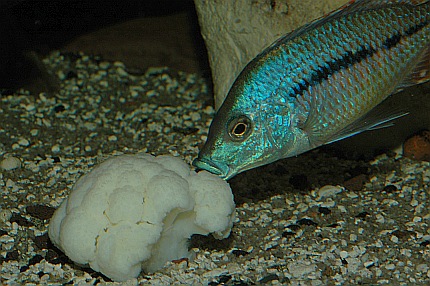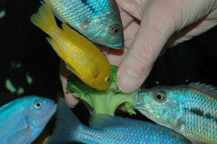 Der Blumenkohl ist mit einem Bleiband beschwert. Der Pfleger ist im Begriff, das etwa halb faustgroße Stück Kohl langsam auf dem Bodengrund abzusetzen, da stürzt sich schon eine Horde von Malawiseebuntbarschen auf das weiße Gemüse. Mbunas und Nicht-Mbunas tummeln sich im Pulk um den Blumenkohl und versuchen vehement, kleine Stücke herauszubeißen. Nachdem das Futter kurz vor der Frontscheibe etwas in den Kies gedrückt wurde, spielen sich die weiteren Freßszenen dicht vor den Augen des Betrachters ab. Die Gier hat jetzt etwas nachgelassen, der erste Futterneid ist vorbei; trotzdem kommen die Buntbarsche immer wieder zurück und fressen vom Blumenkohl. Nach kurzer Zeit stoßen einige Harnischwelse zur Futterquelle und nehmen diese in Beschlag. Vor allem, wenn es sich größere Saugwelse auf dem Futter bequem machen, haben die Cichliden das Nachsehen. Man muss sich fragen, ob diese unnatürliche Ernährung von Malawiseebuntbarschen überhaupt einen Sinn ergibt. Schließlich dürften all diese Arten, von vielleicht wenigen Ausnahmen abgesehen, eigentlich als Carnivore, also Fleischfresser, einzustufen sein. Dies gilt auch für die Mbunas, die Felsenbuntbarsche, die ja als typische Aufwuchsfresser bekannt sind (auch wenn es für Aufwuchsfresser eine gesonderte Ernährungstyp-Kategorie gibt, nämlich die der Limnivoren). All diese Arten ernähren sich zwar mehr oder weniger überwiegend von Aufwuchs. Aber Aufwuchs ist gemäß Definition nicht nur der Algenbewuchs auf Hartsubstraten, sondern die Gesamtheit der Algen zusammen mit dem bakteriellen Bewuchs (die weitverbreiteten Calothrix-Algen zählen systematisch betrachtet zu den Blaualgen und damit zu den Cyanobakterien) und den darin siedelnden Kleintieren, wie zum Beispiel Würmer, Insektenlarven und Kleinkrebschen. Und nur auf letztere kommt es den Felsenbuntbarschen an, die je nach art- oder gatttungstypischer Fressweise den Aufwuchs abschaben oder abzupfen, nach losen Bestandteilen durchkämmen oder regelrecht durchbürsten, oder aber gezielt die Leckerbissen, sprich Kleintiere, heraussuchen, und dabei wohl eher unabsichtlich ein paar Algen mit aufnehmen. Nicht nur die allermeisten Felsenbuntbarsche sind als Aufwuchsfresser einzuordnen. Etliche Vertreter der so genannten Non-Mbuna (Nicht-Mbunas), die über felsigen und/oder gemischten Sand-Fels-Untergründen vorkommen, ernähren sich zu einem guten Teil von Felsaufwuchs. Zu erwähnen sind hier vor allem die Gattungen Protomelas, Cheilochromis, Eclectochromis, Lichnochromis sowie Oreochromis und Otopharynx. Aber auch der in Vallisnerienfeldern verbreitete Vallisnerienlutscher Hemitilapia oxyrhynchus ernährt sich, soweit bekannt, in erster Linie von Aufwuchs, der von den Pflanzentrieben abschabt wird. Es ist naheliegend anzunehmen, dass all diese Arten die pflanzlichen Nahrungsbestandteile meist nicht gezielt, sondern eher ungewollt mit aufnehmen. Im Aquarien lässt sich denn auch leicht zeigen, dass diese Buntbarsche ein schönes, saftiges Salatblatt einfach links liegen lassen, sobald man Frostfutter zum Beispiel in Form von Roten Mückenlarven oder ausgewachsenen Salinenkrebschen ins Becken gibt. Und bei reichlicher Gabe einer rein fleischlichen Kost, wie beispielsweise dem früher häufiger gefütterten Rinderherz, läuft man Gefahr, dass Mbuna-Cichliden nach der Fütterung wie Kugelfische aussehen - mit all den mittlerweile bekannten, möglichen negativen Auswirkungen auf das Verdauungssystem. Strikt genommen nehmen auch solche Malawiseebuntbarsche Algen und pflanzliche Bestandteile auf, die über Sandflächen leben und ihre Nahrung in Form von Kleintieren aus dem Untergrund sieben. Die auf dem Sand und in den obersten Sandschichten lebenden Algen, insbesondere Kieselalgen, wurden in den Mägen etlicher Sandgrund bewohnender Arten (z. B. Lethrinops) nachgewiesen. Plankton fressende Arten wie die Vertreter der Gattungen Copadichromis und Nyassachromis, nehmen Zoo- und Phytoplankton, also im Wasser schwebende Algen, auf. Und selbst Raubfische kommen in den Genuss pflanzlicher Kost, da die Gedärme ihrer Opfer diese oftmals enthalten. Führt man sich all diese Zusammenhänge vor Augen, so kommt man zu dem Ergebnis, dass Malawiseebuntbarsche im Aquarium in vielen Fällen vermutlich viel zu wenig vegetarische Kost erhalten. Zwar hat sich im Laufe der Jahre generell die Erkenntnis durchgesetzt, dass insbesondere die Felsencichliden häufiger mal mit „Grünflocke“ gefüttert werden sollten. Und dass sich ballastreiche, also pflanzliche Bestandteile enthaltene Nahrung offenbar gesundheitsfördernd auswirkt, so dass die Zahl der Darmerkrankungen verringert wird. Auch gibt es mittlerweile spezielle, für Aufwuchsfresser konzipierte Flocken- beziehungsweise Pelletfuttersorten. Trotzdem findet man in der Fachliteratur nur wenige Hinweise auf die vegetarische Ernährung von Malawiseebuntbarschen. Allgemein werden zwar häufig überbrühter oder eingefrorener Salat (um die Blätter weicher zu machen) sowie gefrorener Spinat (der beim Auftauen ebenfalls schon etwas zerfasert und damit leichter fress- und verdaubar ist) als geeignete Nahrungsmittel für vegetarisch interessierte Aquarienfische gepriesen, doch darüber hinaus gehende und vor allem konkrete Vorschläge wird man oftmals vergebens in der einschlägigen Literatur suchen. Einige sehr interessante allgemeine Ausführungen finden sich bei Bremer (1997: 129), die ich hier kurz wiedergeben möchte. Unter dem Zwischentitel „Pflanzliche Futtermittel“ stellt Bremer unter anderem fest, dass „ohne pflanzliche Anteile in der Nahrung (...) kein Fisch dauerhaft und leistungsfähig leben (kann)“, und dass „Im Zusammenwirken mit der Darmflora (...) hochspezifische Verbindungen (entstehen), die auf Kommunikation und Verhalten der Fische Einfluß (nehmen)“. Bremer führt auch die Erfahrungen von Tramm (1992) an, der in der Datz über die Verfütterung von Erbsen, Rosenkohl, Karotten, Kartoffeln und Zucchini in der Ancistrus-Zucht un