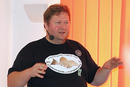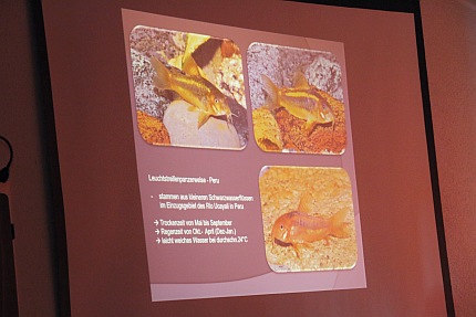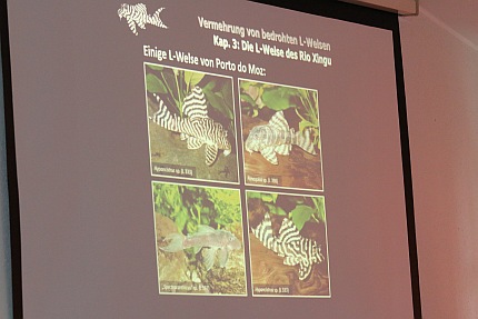 Der bekannte Buchautor Ingo Seidel ging in seinem Vortrag "Vermehrung von bedrohten L-Welsen aus dem Unterlauf des Rio Xingu in Brasilien" auf die im Rio Xingu in Brasilien lebenden Harnischwelse ein. In diesem Flussgebiet wurde der Belo-Monte-Staudamm gebaut, dessen baldige Inbetriebnahme die Trockenlegung mehrerer Nebenarme zur Folge haben wird. In einer der betroffenen Flussschleifen kommt der wohl bekannteste Harnischwels, der „L 46“ oder auch Zebrawels genannt, vor. Die Art lebt dort endemisch und ist neben vielen anderen Fischen, wie z.B. dem eher unscheinbaren „L 332“, vom Aussterben bedroht. Mit beeindruckenden Bildern machte Ingo Seidel auf die Problematik aufmerksam und ging im zweiten Teil seines Vortrags auf die Haltung und Zucht im Aquarium ein. Dabei gewährte der weltweit anerkannte Buchautor und Wels-Experte Einblicke in seine Zuchtanlage und gab wertvolle Züchterkniffe preis. Neben unterschiedlichsten Hypancistrus-Arten lag der Hauptfokus auf dem schon erwähnten Zebrawels „L 46“ (Hypancistrus zebra) und dem „L 174“. Wasserwerte und Aquariengröße spielen bei der erfolgreichen Vermehrung eine wichtige Rolle. Auch die Bauart und die Anordnung der meist aus Ton bestehenden Höhlen müssen beachtet werden. Nach einer lebhaften Diskussion appellierte Ingo Seidel an die Teilnehmer sich zu bemühen, die vom Aussterben bedrohten Arten zu erhalten.