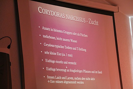 Der Schwerpunkt des Vortrags "Zucht und Aufzucht von Narcissus-1-Arten aus Brasilien" von Robert Budrovcan lag bei den sogenannten „Langschnäuzer-Panzerwelsen“. Wie schon Ingo Seidel ging auch er auf die natürlichen Lebensräume der Fische ein, die ebenfalls durch das Eingreifen des Menschen stark gefährdet sind. „Deshalb ist es auch hier wichtig, dass sich Züchter vernetzen und gemeinsam zur Arterhaltung beitragen“, so der Wels-Experte. Am Beispiel des Panzerwelses „Corydoras narcissus“ aus dem Rio Purus erklärte Robert Budrovcan, was es bei der Haltung und Zucht zu beachten gilt. Die von ihm gepflegten Tiere werden in großen flachen Aquarien mit wenig Strömung gepflegt. Zur Vorbereitung der Zucht wird dann mit weniger Trocken- und mehr Lebendfutter gefüttert. Die Strömung wird erhöht und bei entsprechenden Wasserwerten ist die nicht ganz einfache Zucht durchaus möglich. Auch Robert Budrovcan zeigte Fotos seiner privaten Zuchtanlage und ging auf weitere seltene Arten wie z.B. Corydoras serratus, Corydoras ourastigma, „C 115“ und „C 116“ ein.