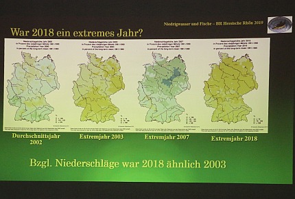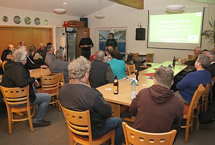Über 40 Interessierte waren in den Tümpelgarten nach Fulda gekommen, um sich den Vortrag „Auswirkungen des Extremsommers 2018 auf die Fischfauna in hessischen Fließgewässern“ anzuhören, der von dem bekannten Biologen Christoph Dümpelmann gehalten wurde. In seiner Begrüßung freute sich Gastgeber Sven Haustein von dem Fuldaer Aquarien- und Terrarienverein „Scalare“ über das große Interesse. Er dankte gleichzeitig Veranstalter Joachim Walter, dass er immer wieder den Tümpelgarten als Veranstaltungsort für Vorträge des Biosphärenreservats Rhön berücksichtigt. Seit einigen Jahren sind die „Scalare“ Projektpartner von Biosphärenreservat Rhön und unterstützen bei der Erhaltung der gefährdeten Fischart Karausche, die nur noch selten in unserer Region anzutreffen ist. Das Jahr 2018 war nicht nur von großer Hitze geprägt, sondern auch die fehlenden Niederschläge in den Sommermonaten waren auffällig. Christoph Dümpelmann ging in seinem Vortrag auf die Auswirkungen auf Fließgewässer ein, deren Niedrigwasserstände den Lebensraum vieler Fischarten einschränkte. Anhand von Wetteraufzeichnungen zeigte er die Entwicklung der letzten Jahrzehnte. Extremjahre mit durchschnittlich wenig oder zu viel Regen gab es immer schon. Das Jahr 2007 hatte z.B. Niederschläge, die deutlich über dem Schnitt lagen. Die Sommermonate der Jahre 2003 und 2018 waren vergleichbar bezüglich der Anzahl heißer Tage (Tage über 30°C) und der fehlenden Niederschläge. Die Wasserstände sinken und die Temperaturen steigen in den Fließgewässern. Da sich in warmem Wasser Sauerstoff weniger löst als in kaltem, verschlechtern sich die Lebensbedingungen für einige Fischarten. Die heimische Bachforelle braucht beispielsweise sauerstoffreiches und kühles Wasser. „Aus diesem Grund ist es bei Besatzmaßnahmen durch Angelvereine wichtig, dass Forellen in typischen Fließstrecken der sogenannten Forellenregion besetzt werden, wo sich die Wassererwärmung bei Sommern wie im letzten Jahr in Grenzen hält“, so Dümpelmann. Ansonsten sterben ganze Generationen junger Forellen, da sie hohe Wassertemperaturen nicht vertragen. Einige Arten wie z.B. die Quappe kann bei Wassertemperaturen von über 18°C Nahrung nicht mehr richtig verdauen und stellt das Fressen ein. Das wiederum wirkt sich negativ auf den Laichansatz der Fische und die daraus folgende Reproduktion aus. Ein weiteres Problem sind Krankheiten und Seuchen, die sich in warmem Wasser schneller ausbreiten. Im Extremsommer 2003 sorgte z.B. eine Seuche für ein großes Aalsterben in heimischen Fließgewässern. Ein weiterer Verlierer des Niedrigwassers ist der Zander, einer unserer beliebtesten Speisefische. Die Art ist lichtempfindlich und zieht sich deshalb in die tieferen Wasserregionen zurück. „Es gibt aber nicht nur Verlierer, sondern auch Gewinner bei einem solchen Extremsommer wie in 2018“, so Christoph Dümpelmann in seinem Vortrag. Die Fischarten, die zu den sogenannten Sommerlaichern gehören, wie beispielsweise die karpfenähnlichen Friedfische, profitieren von einem heißen Sommer. Das Flachwasser ist ideal für die Fischbrut und die hohen Temperaturen sorgen für ein rasches Wachstum. Weitere Profiteure eines solchen Sommers wie in 2018 sind außerdem Raubfische wie Hechte und Flussbarsche, die aufgrund der guten Vermehrungsbedingungen von Friedfischen quasi im Futter schwimmen. Christoph Dümpelmann berief sich in seinem Vortrag immer wieder auf Zahlen sowie wissenschaftlich erhobenen Daten und Fakten die deutlich machten, dass die durchschnittliche Jahrestemperatur im linearen Trend ansteigt. Die mit über 30°C als „heiße Tage“ bezeichnet werden nehmen zu und die sogenannten „Eistage“ (mindestens 24 Stunden unter 0°C) nehmen in einem Jahresranking von 1951 bis 2018 ab. Es ist also durchaus damit zu rechnen, das solche Sommer wie im letzten Jahr häufiger werden. Die heimische Bachforelle, so Dümpelmann, wäre einer der großen Verlierer dieser Entwicklung, der Wildkarpfen sicherlich einer der Gewinner. Am Ende des Vortrags dankte Joachim Walter vom Biosphärenreservat Rhön dem Biologen Christoph Dümpelmann für den interessanten Vortrag. Sven Haustein wies auf den nächsten Vortrag am 26. März hin, bei dem Dr. Sibylle Schroer vom Leibnitz-Institut über die Auswirkungen von Licht auf die Gewässerökologie im Tümpelgarten berichtet. Der Fuldaer Aquarien- und Terrarienverein selbst öffnet seine Ausstellung wieder am Karfreitag und alle Informationen hierzu finden sich auf der Webseite www.scalare-fulda.de und dem Veranstaltungsprogramm von Biosphärenreservat Rhön. Text und Fotos: Sven Haustein