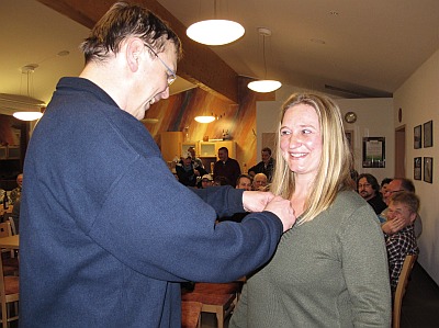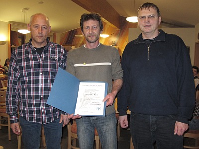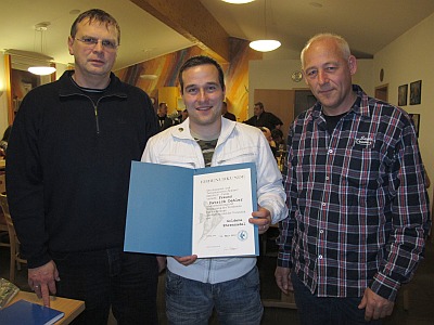 Eine besondere Ehre wurde an diesem Abend den Vorstandsmitgliedern Patrick Dehler und Sven Haustein zuteil. Beide wurden mit der goldenen Ehrennadel des Vereins ausgezeichnet. Patrick Dehler ist von klein auf Mitglied im Verein und ist neben seiner Vorstandstätigkeit als Beckenpfleger in der Ausstellung aktiv. Sven Haustein, der mit Patrick Dehler schon in der Jugendgruppe war, wurde ebenfalls für seine Verdienste für den Verein mit der goldenen Ehrennadel ausgezeichnet. Beide waren sichtlich gerührt und bedankten sich für diese hohe Auszeichnung. Bei den Wahlen wurde Hauptkassierer Peter Fritschi einstimmig in seinem Amt bestätigt. Er bedankte sich bei den Anwesenden für das Vertrauen und freut sich auf eine weitere Amtszeit.