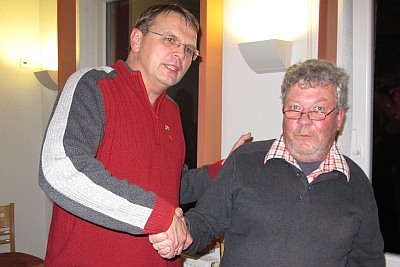 unser 1. Vorsitzender Christian Redweik hat mir die ehrenvolle Aufgabe übertragen, ein langjähriges und verdientes Vereinsmitglied zu ehren und die Laudatio über sein herausragendes Engagement zu halten. Nach einer turbulenten Jahreshauptversammlung im Frühjahr 1977 im Bamberger Hof in Fulda ist Uli Dehler mit mir ins kalte Wasser gesprungen und hat die volle Verantwortung als 1. Kassierer für diesen Verein übernommen, obwohl er erst kurz zuvor in unseren Verein eingetreten war. Große Aufgaben waren zu bewältigen bei einem geringen Kassenbestand von gerade mal 2.000 DM. Der Anbau zum Weiher, in dem wir gerade sitzen, war im Rohbau. Das Fundament war gerichtet, das Fachwerk stand und war von außen mit Brettern verschalt. Das Dach war notdürftig gedeckt. Es fehlte der Innenausbau, der Fußboden war nicht vorhanden und es fehlte vor allem Geld, um das alles fertigzustellen. So machten Uli Dehler und ich uns tatkräftig an die Arbeit Finanzen zu beschaffen und durch viel Eigenleistung den Anbau voranzutreiben. Uli Dehler hatte die Idee einen Preisskat einzuführen. Dies geschah dann jeweils zum Gründonnerstag zum Beginn der Aquarien- und Terrarienausstellung sehr erfolgreich. Uli Dehler leitete viele Jahre das Turnier und besorgte hochwertige Preise. Und so gab es viele weitere Projekte: Die Kaltwasseranlage war marode und musste erneuert werden. Die Georg-Rösch-Hütte, die damals als Ausstellungsraum diente wurde zu klein und konnte die Belastung nicht mehr tragen. Die Toiletten mussten erneuert werden und so weiter… Uli Dehler hat mit mir beim damaligen Oberbürgermeister Dr. Wolfgang Hamberger erfolgreich die Verhandlungen zur Bezuschussung verschiedener Projekte geführt. Zusammen haben wir viele Fastnachtsveranstaltungen abgehalten bei denen wir gemeinsam in Sketchen und Büttenreden auftraten. Uli hat Einmärsche von Garden und Prinzenmannschaften organisiert und war an allen Veranstaltungen aktiv beteiligt. Bis heute pflegt er Aquarien in unserer Ausstellung – für ihn war und ist das stets eine Selbstverständlichkeit gewesen, den Verein zu unterstützen. Das alles war nur ein kleiner Ausschnitt von dem, was Uli Dehler für unseren Verein geleistet und wofür er große Verantwortung über viele Jahre getragen hat. Es ist mir eine große Ehre heute meinen langjährigen Kassierer und Freund Uli Dehler mit der Ehrenmitgliedschaft auszuzeichnen.“