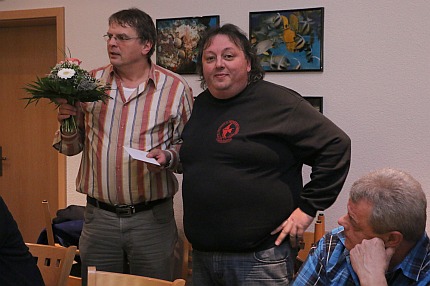 Bevor es zu den Ehrungen verdienter Mitglieder kam gratulierte Christian Redweik Vereinsfreund Uwe Radziejewski zum runden Geburtstag und übereichte ihm ein Präsent. Uwe Radziejewski beteiligt sich seit vielen Jahren aktiv an der Ausstellung und pflegt derzeit im Außenbereich ein Gehege mit Eichhörnchen.
