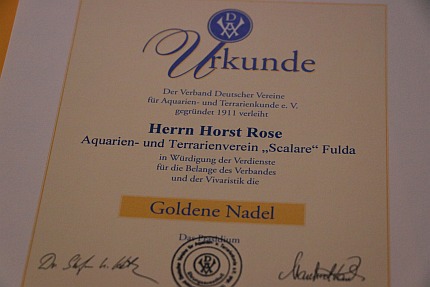 Eine besonders große Ehre wurde dem Ehrenmitglied und Ehrenfachwart Horst Rose zuteil. Für seine überragenden Verdienste wurde ihm die höchste Verbandsauszeichnung, die goldene Ehrennadel, verliehen. Horst Rose war fast drei Jahrzehnte als 1. Fachwart für die Aquarien- und Terrarienausstellung im Tümpelgarten verantwortlich.