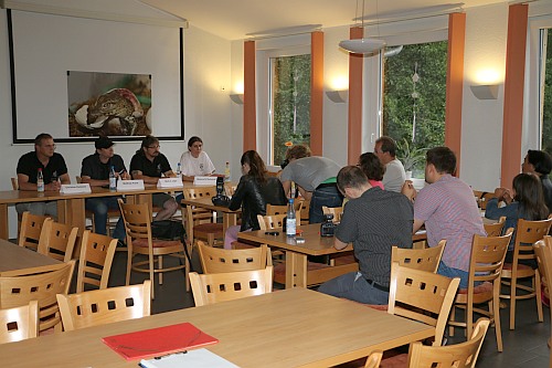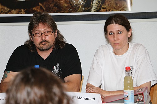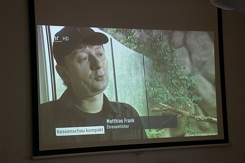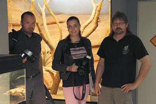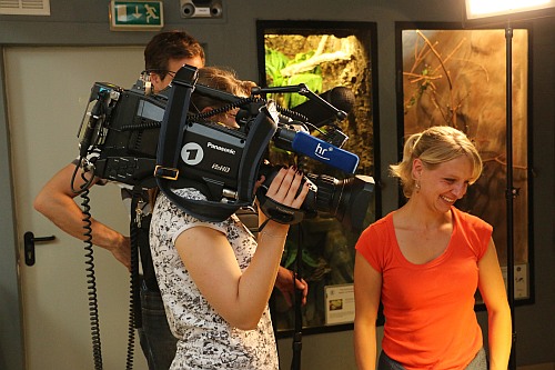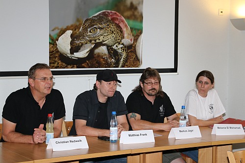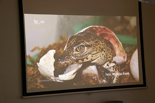 Das Interesse der lokalen und überregionalen Medien war groß, nachdem der Fuldaer Aquarien- und Terrarienverein „Scalare“ zur Pressekonferenz am 1. September um 16 Uhr in den Tümpelgarten eingeladen hatte. Bei den Kubakrokodilen handelt es sich um die ersten reinerbigen Nachkommen, die in Deutschland gezüchtet wurden. Der Verein leistet mit diesem Erfolg einen großen Beitrag für den Arterhalt dieser vom Aussterben bedrohten Panzerechsen. Für die Fuldaer „Scalare“ sind die jungen Kubakrokodile der größte Zuchterfolg in der 90-jährigen Vereinsgeschichte. Bereits einen Tag vor der Pressekonferenz kam die HR-Journalistin Petra Klostermann in den Tümpelgarten, um mit den erfolgreichen Züchtern der Kubakrokodile Matthias Frank und Markus Jäger einen Radiobeitrag für den Sender HR4 aufzunehmen. Petra Klostermann, die selbst aus Fulda stammt, kennt den Verein gut und hat in der Vergangenheit schon mehrere Beiträge über die „Scalare“ produziert. Sie kennt die Geschichte der Kubakrokodile und konnte so von den Züchtern und dem 1. Vorsitzenden Christian Redweik interessante Informationen für ihre Hörerinnen und Hörer erfahren. Auch das HR-Fernsehen kam mit einem Kamerateam zu den „Scalaren“ und drehte direkt in der Ausstellung vor dem großen Krokodil-Terrarium. Matthias Frank beantwortete die Fragen souverän und war sichtlich stolz über den einzigartigen Zuchterfolg. Aber auch die Journalisten des Hessischen Rundfunks waren von der Ausstellung und den jungen Krokodilen beeindruckt. Einen weiteren Rundfunkbeitrag nahm der Sender Hit Radio FFH im Vorfeld der Pressekonferenz auf und befragte ebenfalls die beiden Krokodilexperten Matthias Frank und Markus Jäger vom Fuldaer Aquarien- und Terrarienverein. Zu der eigentlichen Pressekonferenz waren Vertreter der Print- und Onlinemedien gekommen, die vom 1. Vorsitzenden Christan Redweik begrüßt wurden. Neben den Züchtern Matthias Frank und Markus Jäger unterstützte auch die 2. Schriftführerin Melanie el Mohamad bei den Fragen der anwesenden Journalisten von der Fuldaer Zeitung, Osthessen News, Fulda Info, Fulda Aktuell, Marktkorb und Osthessen Zeitung. Auch der Pressesprecher des Fuldaer Oberbürgermeisters - Michael Schwab - war in den Tümpelgarten gekommen. Für die Fuldaer „Scalare“ geht ein spannender Tag zu Ende und die Mitglieder freuen sich auf die Berichterstattung. Die jungen Kubakrokodile sind ab sofort an Sonn- und Feiertagen zwischen 10 und 17 Uhr in der Ausstellung im Tümpelgarten zu sehen.