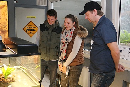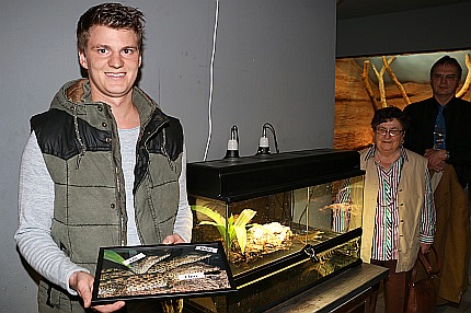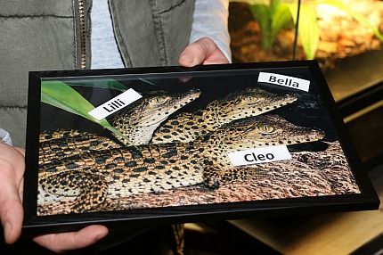 Viele Vorschläge wurden eingereicht, nachdem die Fuldaer Zeitung dazu aufgerufen hatte Namen für drei der insgesamt vier Krokodile zu finden. Das zuerst geschlüpfte Kubakrokodil bekam von den Züchtern Melanie el Mohamad, Matthias Frank und Markus Jäger den Namen Urmel. Nachdem eine Jury die eingegangenen Namen gesichtet hatte stand mit Dominik Keitzer der Sieger fest. Seine Vorschläge Lilli, Bella und Cleo gefielen den Entscheidern am besten und bei der symbolischen „Taufe“ bekam der Sieger einen Buchgutschein von Parzeller und eine Jahresfamilienkarte für die Aquarien- und Terrarienausstellung im Tümpelgarten. Die FZ-Journalistin Jacqueline Kleinhans, die bereits einige Berichte über den deutschlandweit erstmaligen Zuchterfolg geschrieben hatte, freute sich, dass neben dem Sieger auch viele Interessierte in den Tümpelgarten gekommen waren. Nachdem Dominik Keitzer den drei Krokodilen die Namen zugeordnet hatte, fragten sich die Anwesenden zurecht, wie die gleich aussehenden Tiere überhaupt unterschieden werden können. Die Pfleger erklärten darauf hin, dass das Muster bei jedem Krokodil individuell sei, ähnlich wie bei einem Fingerabdruck. Hierdurch können die insgesamt vier Nachzuchten gut unterschieden werden. Die jungen Kubakrokodile sind noch bis Anfang November an Sonn- und Feiertagen von 10 bis 17 Uhr in der Ausstellung im Tümpelgarten in Fulda zu sehen. Text und Fotos: Sven Haustein