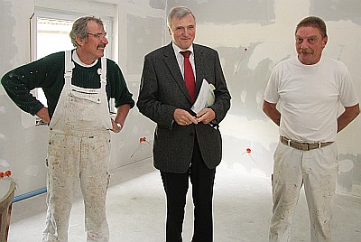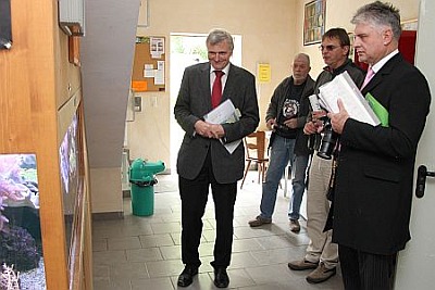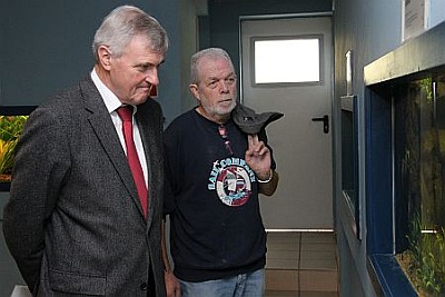 Dass der Fuldaer Oberbürgermeister Gerhard Möller immer ein offenes Ohr für die Anliegen seiner Bürger und Vereine hat, ist in der osthessischen Barockstadt wohl bekannt. Und so war es für den Vorstand des Aquarien- und Terrarienvereins „Scalare“ kein Problem, vor dem Beginn der Vereinsheimsanierung einen Termin bei ihm und der Stadtbaurätin Cornelia Zuschke zu bekommen um das Projekt vorzustellen und zu besprechen. Und nun – gut drei Monate später – kam der Oberbürgermeister in den Tümpelgarten, um sich direkt vor Ort ein Bild über den Baufortschritt zu machen. Nach einem Rundgang durch das an der Fulda gelegene Vereinsgelände wurden die Räume besichtigt, die zurzeit saniert werden. Auf der Baustelle war richtig was los, denn einige Vereinsmitglieder waren gerade dabei, Trockenbauwände abzuschleifen oder andere Arbeiten voranzutreiben. Und da war es für alle Anwesenden eine große Freude, direkt mal dem Fuldaer Stadtoberhaupt sprechen zu können und das bisher geleistete zu erläutern. Gerhard Möller hatte genug Zeit mitgebracht um auch noch einen Rundgang durch die Aquarien- und Terrarienausstellung zu machen, die ihn sichtlich beeindruckte. Der Oberbürgermeister hat mit seinem Besuch gezeigt, dass er auch nach dem Gespräch vor gut drei Monaten einen Blick auf den Verein hat. Für die Mitglieder war dies ein wichtiger Motivationsschub für die noch anstehenden Arbeiten und die Fuldaer „Scalare“ freuen sich heute schon auf ein baldiges Wiedersehen mit OB Gerhard Möller im Tümpelgarten.