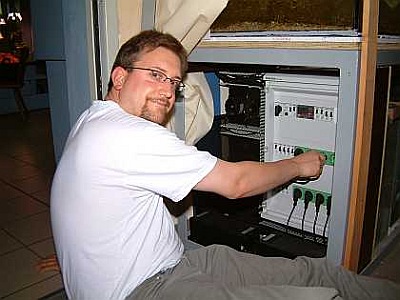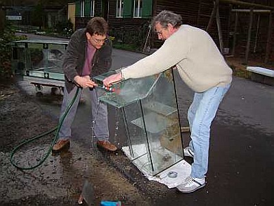 Das Jahr 2000 war für den Fuldaer Aquarien- und Terrarienverein „Scalare“ 1925/55 e.V. Fulda ein geschichtsträchtiges und spannendes Jahr zugleich. Zum Einen konnten wir unser 75-jähriges Jubiläum feiern und zum Anderen ging unser neue Ausstellung nach 3 Jahren Bauzeit endlich in Betrieb. Unser Aquarianer und Terrarianer waren richtig stolz, dass wir, die Fuldaer „Scalare“, eine der größten Ausstellungen in Deutschland die von einem Verein betrieben wird, in Eigenleistung aufgebaut hatten. Die große Terrarienabteilung mit dem Pärchen Kubakrokodile „Klara und Willi“, die übrigens einmalig in der Bundesrepublik sind und eine Aquarienabteilung mit einer brillant durchdachten Technik und Artenvielfalt können sich wirklich sehen lassen. Doch eine Lücke gab es da leider in unserem selbstgeschaffenen kleinen Vivaristik-Paradies: Wir hatten nicht ein Seewasseraquarium in der gesamten neuen Ausstellung. Früher, in der alten Georg-Rösch-Hütte, hatten wir immer mehrere Aquarien mit Meerwasser. Seewasser- oder Meerwasseraquarien mit Fischen und niederen Tieren sind als die „Königsdisziplin“ in der Aquaristik zu verstehen – also vergleichbar mit der Formel1 im Motorsport. Sechs Jahre gelang es uns nicht, in der neuen Ausstellung ein Seewasseraquarium zu etablieren. Aquarianer, die sich in diesem Metier auskennen gibt es zwar in unserem Verein, aber inzwischen ist es sehr schwer geworden, Fische, niedere Tiere, Technik, etc. zu bezahlbaren Preisen zu bekommen. Ein Seewasseraquarium in einer solchen Ausstellung wie in unserem Verein sollte schon eine ordentliche Größe aufweisen und dem entsprechend teuer wird ein solches Vorhaben. Einige Mitglieder hatten sich schon fast damit abgefunden, dass wir wohl so schnell diese „Königsklasse“ nicht mehr betreten würden. Am 17. Dezember 2004 wurde dieses Thema wiederbelebt. Nach dem traditionellen Jahresrückblick wurde der obligatorische „Bildgroschen“ erstmals für das an diesem Abend geborene „Projekt Seewasser“ verwendet, dass vom 1. Schriftführer ins Leben gerufen wurde. Hiermit sollte ein Anfang gemacht werden und die Seewasseraquarianer und Mitglieder neu für dieses Thema motiviert werden. Wie es der Zufall so wollte kam kurz nach dieser Aktion der Anruf eines Aquarianers aus der Region, der sein Seewasseraquarium aufgeben wollte und sich an uns wendete. Das war eine super Möglichkeit und ein tolles Angebot – aber wer soll das Projekt als Verantwortlicher in die Hand nehmen? Man war sich schnell einig, dass hierfür der erfahrenste Seewasseraqurianer unseres Vereins (Meinung des Autors und vieler Vereinsfreunde), unser ehemaliger 2. Vorsitzender und langjähriger Jugendwart und Beckenpfleger Gerhard Schröter der richtige Mann wäre. Vereinsfreunde wie z.B. Uli Dehler und unser Fachwart Horst Rose schafften es, ihn hierfür zu begeistern. Gerhard, der inzwischen ca. 40 Kilometer von Fulda entfernt wohnt machte uns damals klar, dass er einen zweiten Mann für dieses Projekt bräuchte. Wir alle wissen, dass es nicht ganz leicht ist, zu zweit ein Aquarium zu pflegen. Das ganze funktioniert nur dann, wenn die Beckenpfleger sich sehr gut verstehen und teamfähig sind. Es dauerte nicht lange, da war auch hier der richtig Aquarianer gefunden. Markus Müller, der bei Gerhard Schröter in der Jugendgruppe in unserem Verein „groß“ geworden ist, stellte sich hoch motiviert und begeistert der Herausforderung. Da er vorher noch nie Seewasseraquarien gepflegt hatte war es für ihn die große Chance, quasi von der Pieke auf diese höchste Klasse unseres Hobby von einem erfahrenen Lehrmeister zu erlernen. Wir anderen Vereinsmitglieder merkten sehr schnell, dass sich hier ein Dream-Team gebildet hatte. Markus Müller, der die komplette neue Ausstellung elektrotechnisch geplant und praktisch umgesetzt hatte, kümmerte sich um die Aufwendige Technik und baute in die inzwischen zu uns geholte Seewasseranlage so manche Raffinesse ein. Gerhard Schröter, der Seewasser-Altmeister, kümmerte sich erst mal um die vorhanden Fische und niederen Tiere und brachte seinem „Lehrling“ so langsam die Geheimnisse der Meerwasseraquaristik näher. Ein Seewasseraquarium mit Fischen und niederen Tieren in Betrieb zu nehmen ist sehr aufwendig und kann in keinster Weise mit Süßwasser verglichen werden. Die komplizierte Filtertechnik und das regelmäßige zusetzen von diversen Spurenelementen verlangt eine Menge an Erfahrung und Fachwissen. Bis die sogenannten „lebenden“ Steine eingesetzt werden können, aus denen sich verschiedene niedere Tiere entwickeln, braucht eine Menge Zeit, wenn man es fach- und artgerecht angeht. Selbstverständlich war das Seewasseraquarium im vergangenen Jahr das Gesprächsthema Nr. 1 in unserem Verein. In den letzen zwei Monaten kam dann langsam eine gewisse Unruhe und Ungeduld auf: Wann kommen denn nun endlich die Fische? Man muss zugeben, dass die beiden Seewasseraquarianer Gerhard Schröter und Markus Müller es fast etwas „spannend“ gemacht haben. Gestern, am 30. März war es dann endlich soweit. Die Fische wurden geliefert und langsam eingesetzt. Die Begeisterung bei den Vereinsfreunden war mehr als groß. Eine regelrechte Euphorie geht seit gestern durch den Verein. Selbstverständlich braucht es noch ein gewisse Zeit, bis die noch relativ jungen Seewasserfische ihre endgültige Größe erreicht haben. Unsere 2. Fachwart Elisabeth „Lissy“ Eifert hatte am 14. Oktober 2005 in unser Gästebuch geschrieben: „Hurra, bald weht auch eine Brise Seeluft durch den Tümpel. Wir könnens kaum erwarten.“ Inzwischen muss man sagen scheint bei uns im Tümpelgarten in unserer Aquarien- und Terrarienausstellung im Rudi-Schmitz-Haus rund um die Uhr die Sonne – gerade wenn man die Beckenpfleger Gerhard Schröter und Markus Müller betrachtet, die seit gestern um die Wette strahlen. An dieser Stelle bedanken wir uns für das großartige Engagement unserer beiden Vereinsfreunde Gerhard Schröter und 