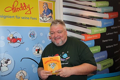 Signierte sein bekanntes Buch "Garnelen-Cocktail" auf der Messe: