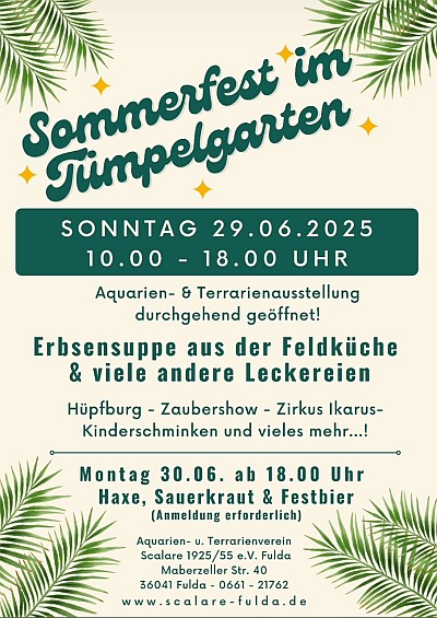 Am Sonntag, den 29. Juni veranstaltet der Aquarien- und Terrarienverein „Scalare“ wieder sein alljährliches Sommerfest mit Spiel, Spaß und Genuss im Fuldaer Tümpelgarten an der Maberzeller Straße. Los geht es ab 10.00 Uhr mit einem Frühschoppen. Wie jedes Jahr gibt es mittags die legendäre Erbsensuppe aus der Feldküche, die Dank der frischen Zutaten ein unverwechselbares Aroma hat, so dass nicht wenige Besucher sogar zusätzlich transportable Essensbehälter mitbringen, um noch ein paar Extraportionen mit nach Hause zu nehmen. Dazu kommen noch viele andere Leckereien vom Grill. Auch für die kleinen Besucher wird ab 13.00 Uhr eine Menge geboten. Während sich die Erwachsenen bei Kaffee und Kuchen entspannen, laden der Kinderspielplatz und die Hüpfburg zum Toben sowie andere, vom Zirkus Ikarus angebotene, Aktivitäten, zum Mitmachen ein. Auch ein Zauberer wird im Laufe des Nachmittags zweimal die kleinen und großen Gäste mit seinem abwechslungsreichen Programm unterhalten und verblüffen. Das Kinderschminken wird sicherlich großen und kleinen Kindern ein Lächeln ins Gesicht zaubern. Natürlich gibt es auch Eis zum Naschen. Selbstverständlich ist auch die Aquarien- und Terrarienausstellung den ganzen Tag geöffnet. Süßwasserrochen, Skalare und ein Schwarzer Piranha sind die Highlights unter den Aquarienbewohnern. Absolute Höhepunkte sind für viele Besucher nach wie vor die großen Kubakrokodile aber auch die Würgeschlangen, Vogelspinnen und Pfeilgiftfrösche sind mehr als nur einen Blick wert. Dass das Sommerfest seit vielen Jahren so beliebt ist, liegt wohl daran, dass das Vereinsgelände „Tümpelgarten“ so herrlich inmitten der Fuldaauen gelegen ist. Es bietet genügend Platz und trotz der vielen Besucher hat man nicht das Gefühl, auf einer „Massenveranstaltung“ zu sein. Man kann besonders als Familie entspannen und einfach einen schönen Tag erleben. Die Kinder werden bestens betreut und der „Wettergott“ hat es mit den „Scalaren“ bisher meistens gut gemeint. Die unmittelbare Nähe zum großen Tümpel und der Fulda bedeutet bei warmen Temperaturen immer ein wenig luftige Abkühlung. Seit 60 Jahren ist der Tümpelgarten die Heimstätte des Vereins und dabei ein beliebtes Ausflugsziel für Groß und Klein geworden. Der Verein selbst wurde bereits 1925 gegründet und dementsprechend wird es im August zum hundertjährigen Vereinsjubiläum eine große Festveranstaltung geben. Auch bei regnerischem Wetter kann ungestört gefeiert werden, denn die überdachten Außenanlagen sowie die großzügig gestalteten Vereinsräume bieten auch für sehr viele Besucher besten Schutz. Eine große Anzahl an Parkplätzen steht direkt gegenüber dem Tümpelgarten, auf dem Gelände des tegut – Marktes, zur Verfügung. Das Vereinsgelände kann an diesem Tag aber auch direkt vom Fuß- und Radweg an der Fulda betreten werden. Der Eingang liegt zwischen der Horaser Eisenbahnbrücke und der Holzbrücke über die Fulda. Die Vereinsmitglieder hoffen, auch dieses Jahr wieder viele Gäste begrüßen zu können.