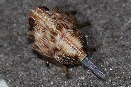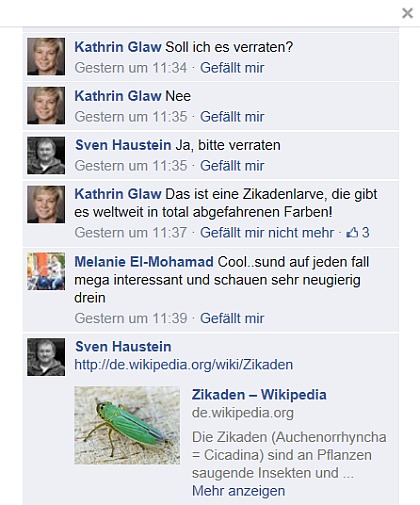 Es sind typische Situationen, die sich - man kann sagen mehrmals wöchentlich - im Tümpelgarten zutragen: Man sitzt in vertrauter Runde auf der Terrasse, fachsimpelt ein wenig über das Hobby und nimmt die Natur der Fuldaauen wahr. Man hört den Gesang unterschiedlichster Vögel und rätselt, um welche Art es sich handeln könnte. Eine paradiesische Idylle für Naturliebhaber, die die Mitglieder und Gäste der Fuldaer „Scalare“ gerne genießen. So geschah es in dieser Woche, dass auf einem Terrassentisch sich ein maximal 2 Millimeter kleines Insekt aufhielt, dass kaum zu erkennen war. Mit einer guten Makro-Kamera wurde ein Bild aufgenommen und das Tier auf dem Bildschirm vergrößert. Keiner der anwesenden Naturfreunde hatte eine Idee, was das denn sein könnte. Im Zeitalter von Smartphones kann man zwar mal schnell googeln, vorausgesetzt man hat eine grobe Ahnung, aber in diesem Fall war nichts herauszubekommen. Schriftführerin Melanie El-Mohamad hatte die Idee, das Foto auf Facebook zu stellen und zu schauen, ob man so etwas erfahren kann. Eine gute Idee, fanden auch Vorstand Markus Jäger und Sven Haustein, die an dem „Rätselraten“ beteiligt waren. Und so wurde das Foto am nächsten Tag auf Facebook gepostet. Obwohl soziale Netzwerke mitunter in der Kritik wegen fehlendem Datenschutz usw. stehen, sind sie doch äußert nützlich. Gerade im Bereich Natur und Tiere und hier insbesondere in der Aquaristik und Terraristik erfährt man sehr viel und der Austausch mit Experten ist unkompliziert und schnell möglich. Auch die Fuldaer „Scalare“ betreiben neben ihrer Webseite zwei Facebook-Seiten. Nachdem das Foto nun auf Facebook stand kam auch prompt die Auflösung, um welches Insekt es sich handelt. Es ist eine Zikaden-Larve, die weltweit in den unterschiedlichsten Farben vorkommt. Der Hinweis kam von Kathrin Glaw, der Chefredakteurin der Verbandszeitschrift VDA-Aktuell (Verband Deutscher Vereine für Aquarien- und Terrarienkunde e.V.). Kathrin Glaw ist nicht nur in der aquaristischen Szene sehr bekannt, sondern war auch schon im Tümpelgarten in Fulda zu Gast und steht mit einigen „Scalare“-Mitgliedern über Facebook in gutem Kontakt. Nach ihrem Post zur Zikaden-Larve entstand dann noch eine schöne Diskussion und wieder einmal wurde klar, dass es wichtig ist gut vernetzt zu sein - und zwar nicht nur über das Internet sondern auch als Verein mit einem Verband wie dem VDA.
